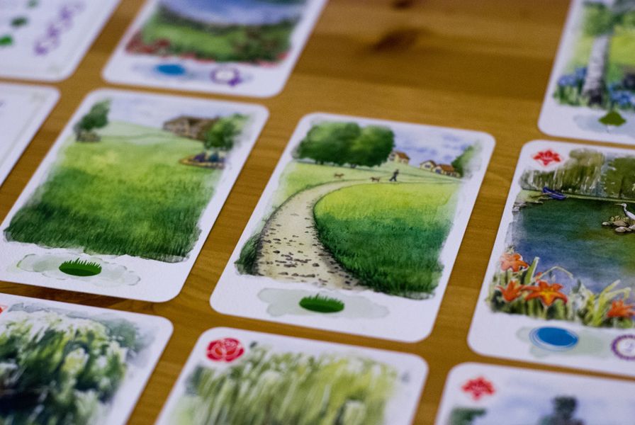 When you put down a green card, it needs to be adjacent to another green card. And the flower type or the color of the flower must match. This locks you into what you can play sometimes. There are some plain cards with no flowers, and you can put those down adjacent to anything. That allows you to connect anything to that card.