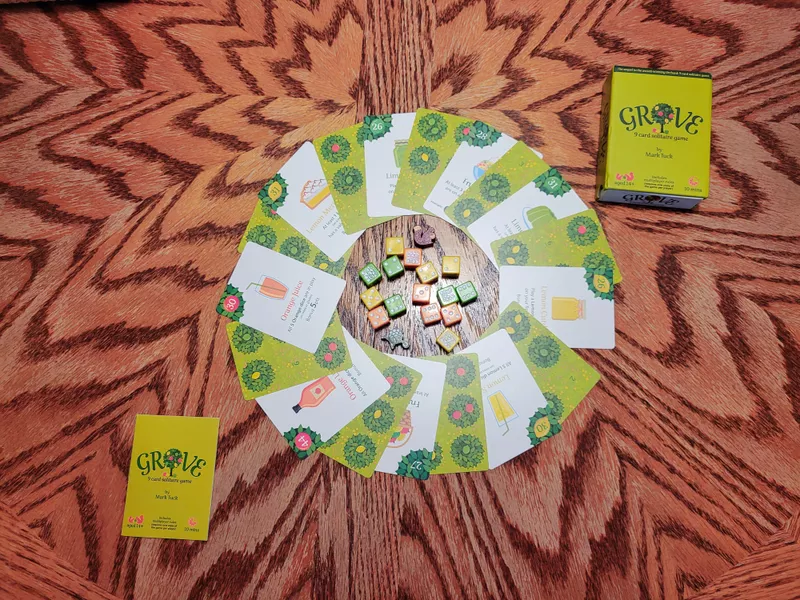 Using the Orchard setup of nine cards, Grove promised a twist on that, however slight it might be. And I’ve played Orchard a lot, over 500 times in the past few years. So I really like Orchard, but will Grove from Side Room Games pass it up? Or does it even do enough different?